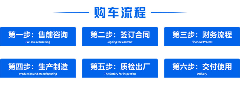 我們将谒誠爲您提供好、快、優質的服務! ·**步:購車洽談: 通過電話聯系或實地考察洽談車輛型号、價格和相關要求。 ·**步:簽訂合同: 雙方簽訂車輛購銷合同并預付合同定金(傳真簽訂合同、實地簽訂合同均可)。 ·第三步:安排生産: 我公司根據合同要求,安排車間生産。 ·第四步:交付車輛: 車輛交付驗收,支付車輛餘款,完成相關手續。 交付方式:客戶可自提車輛,也可協商由我公司安排送車并協定相關費用.更多詳細訂車流程請來電咨詢! |