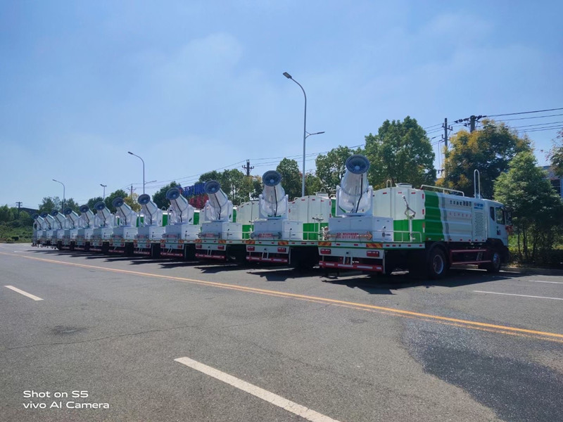 程力公司9月15日批量抑塵車完**車,東風D9抑塵車是防疫消毒神器,康機230馬力發動機,軸距4500mm罐體容積12立方米,後部匹配60米霧炮玉柴東風副發動機,标配前沖後灑氣動閥駕駛室**,環氧玻璃鱗片防腐,13台抑塵車開動馬達噴霧齊射,形成一條美麗的彩虹常駐空中。